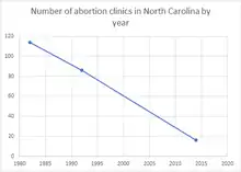 Between 1982 and 1992, the number of abortion clinics in the state decreased by 28, going from 114 in 1982 to 86 in 1992.[21] In the period between 1992 and 1996, the state ranked second in the loss of number of abortion clinics, losing 27 to have a total of 59 in 1996.[22] In 2014, there were 27 facilities that provided abortions, of which sixteen were abortion clinics.[23][24] In 2014, 90% of the counties in the state did not have an abortion clinic. That year, 53% of women in the state aged 15–44 lived in a county without an abortion clinic.[25] In 2017, there were 26 total abortion-providing facilities (with 14 total clinics including 9 Planned Parenthood clinics, of which 5 offered abortion services) in a state with a population of 2,335,631 women aged 15–49.[26][27] Not all people who seek abortions in North Carolina are residents of the state, as clinics in cities near the borders attract people seeking abortions from other states.[11]