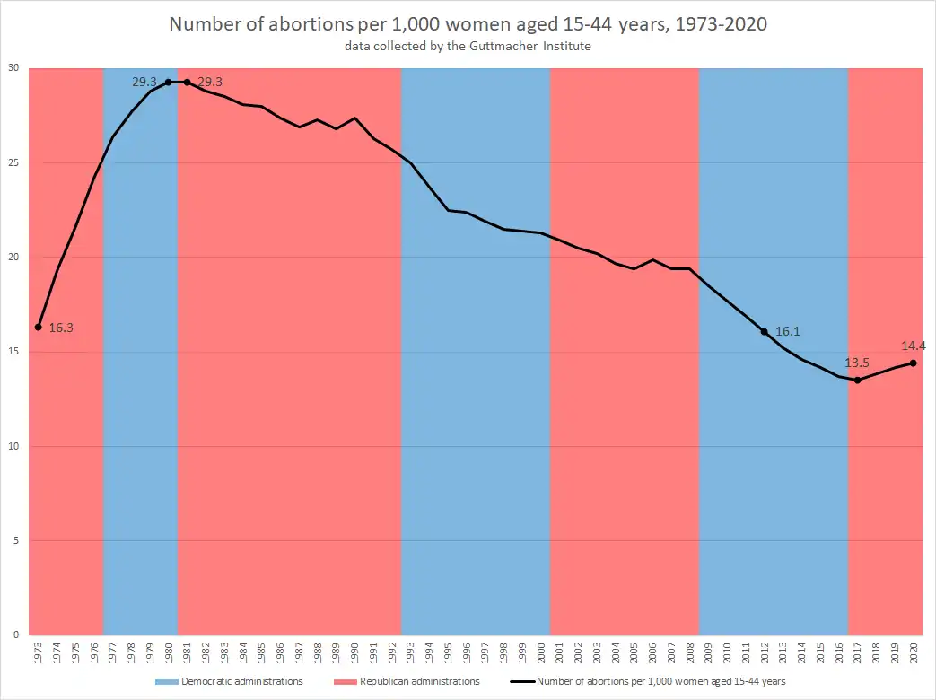 From 1981 through 2017, the abortion rate fell by more than half, falling faster in Democratic administrations than Republican ones. The abortion rate fell below the 1973 rate in 2012 and continued to fall through 2017, when it stood at 13.5 abortions per 1,000 women of childbearing age. The abortion rate then rose from 2018 through 2020.
