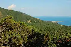 The Abrau Peninsula is the only place in Russia that harbours a Mediterranean vegetation.[1][2] The climate of the Abrau Peninsula is sub-Mediterranean with cool rainy winters without a stable snow cover and with hot dry summers. The mean annual precipitation is 500 mm, the mean July and February temperatures are 23.7°C and 2.7°C, respectively.[3] The area vegetation consists of three major belts:[1] (1) coastal slopes with sub-Mediterranean xerophytic forests and shrublands with pistachio (Pistacia mutica), juniper (Juniperus excelsa, J. oxycedrus, J. foetidissima), oak (Quercus pubescens) and oriental hornbeam (Carpinus orientalis); (2) piedmont and low-mountain area with a combination of mesophitic and xerophytic forests and a predominance of two oak species (Q. pubescens, Q. petraea), oriental hornbeam and junipers; (3) low mountains with mesophitic deciduous forests with a domination of oak (Q. petraea), hornbeam (Carpinus caucasica), lime (Tilia begoniifolia), maple (Acer laetum), ash (Fraxinus excelsior) and beech (Fagus orientalis).[2]