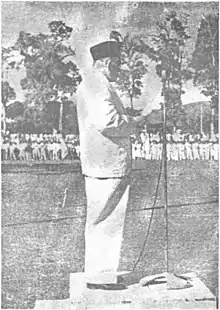 Resident Mr. Abu Bakar Djaar representing The Governor of Central Sumatra giving an opening speech during a flag raising ceremony at Lapangan Kantin Bukittinggi, 21 November 1956
