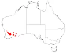 This acacia grows on roadsides, low hills, or ridges in whipstick mallee or gimlet woodland mainly from near Hyden to the Bremer Range in the Avon Wheatbelt, Coolgardie and Mallee bioregions of inland south-western Western Australia.[2][6]
