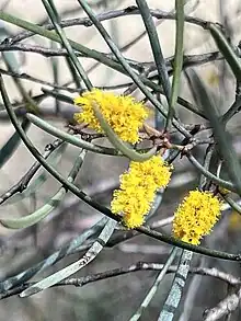 Like most Australian Acacia species, mulga is thornless.[2] The needle-like phyllodes stand erect to avoid as much of the midday sun as possible and capture the cooler morning and evening light. Any rain that falls is channelled down the phyllodes and branches to be collected in the soil immediately next to the trunk, providing the tree with a more than threefold increase in effective rainfall. Mulga roots penetrate far into the soil to find deep moisture. The roots also harbour bacteria that fix atmospheric nitrogen and thus help deal with the very old, nutrient-poor soils in which the species grows.