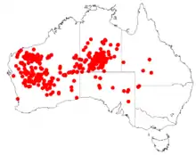 It is found in drier parts of central and western parts of Australia in Western Australia, South Australia, the Northern Territory and outback of New South Wales and Queensland.[2] In Western Australia it is found the Pilbara, Mid West and Goldfields-Esperance regions.[4] It is found in many habitats from stony or gravelly red-brown sandy loam, clay-loam or clay soils often over hardpan. It is also found on alluvial flats and wet areas on slopes and tops of rocky hills.[3] It is found in northern parts of South Australia in the North Western, Lake Eyre and Gairdner-Torrens herbarium regions.[1]