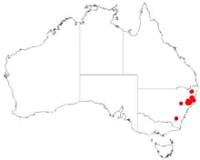 The shrub is found in north eastern New South Wales and is commonly located in the Great Dividing Range from Gibraltar Range National Park in the north down to Barrington Tops National Park in the south where it is often situated around creeks and among or along the edges of swamps growing in granite or basalt based soils as a part of Eucalyptus woodland communities.[3]