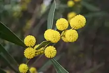 It is a decumbent shrub 1–3 m in height. Its stem and branches are reddish-brown in color. Its phyllodes are oblanceolate to narrowly elliptic, straight or slightly curved. Leaves are green to pale green in color and 6–20 cm long. Midvein and marginal veins are visible. There are 2–9 inflorescences. There are up to 60 individual flowers in each globular cluster. The flowers are bright yellow in color and have a diameter of 8–17 mm. Pods are straight, flat, mostly straight-sided to barely and irregularly more deeply constricted between seeds. These are 5–13 cm long, mostly 5–6 mm wide, firmly papery to thinly leathery. Seeds are longitudinal, with the funicle expanded towards the seed. It flowers in June and August.[1] This plant can be propagated by seed and probably also cuttings.[9]