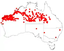 It is widespread in arid areas of northern Australia. It is common in the Pilbara and Kimberley regions of Western Australia.[4] Also found in the Northern Territory and western Queensland, north of 25°S, with an outlier on Dorre Island, Shark Bay, Western Australia. It grows in various kinds of soils, including coastal sand, on rocky hills and gullies, in shrubland and open woodland, and is often associated with spinifex.[2]