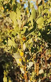 The bushy glabrous shrub has a rounded to spreading habit and normally 1 to 3 metres (3 to 10 ft) in height, sometimes reaching 5 m (16 ft)[4] and usually to a width of 3 m (10 ft).[3] The bark is smooth and a light grey colour. The narrowly elliptic to oblong-elliptic or obovate to oblanceolate, phyllodes have a length of 2 to 7 centimetres (0.8 to 2.8 in) and a width of 6 to 20 millimetres (0.24 to 0.79 in).[3] It produces yellow flowers from April to November.[4] The simple inflorescences have globular heads with a diameter of about 10 mm (0.39 in) containing 16 to 32 rich golden flowers. Following flowering woody light brown seed pods form that are 2 to 10 cm (0.8 to 3.9 in) long and 5 to 9 mm (0.20 to 0.35 in). The pods have a straight to shallowly curved shape and contains glossy, dark brown to black seeds that are arranged longitudinally inside. The seeds have an obloid-ellipsoid shape and are 4 to 6 mm (0.16 to 0.24 in) long and 2.5 to 4 mm (0.10 to 0.16 in) with a red to orange aril.[3]