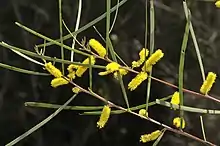 The shrub or tree typically grows to a maximum height of 7 m (23 ft) and has many branches that grow more or less parallel to the main stem. It has dark grey coloured bark that is corrugated and longitudinally fissured. The glabrous and angular branchlets are a pinkish to dull purplish red colour and can be covered in granules and often are resinous. Like most species of Acacia it has phyllodes rather than true leaves. The evergreen, coriaceous, scurfy and glabrous phyllodes are flat and have a linear shape that is straight to shallowly incurved. The narrow blue-grey-green coloured phyllodes have a length of 5 to 21 cm (2.0 to 8.3 in) and a width of 1.5 to 6.5 mm (0.059 to 0.256 in) and have an inconspicuous, parallel midvein. It blooms between August producing golden flowers.[2] The racemose inflorescences produce flower-spikes with a length of 1.2 to 2.8 cm (0.47 to 1.10 in) bearing golden flowers. Following flowering wrinkled and glabrous seed pods form with a linear that are raised over the seeds and have a length of 6 to 8 cm (2.4 to 3.1 in) raised over seeds with longitudinally arranged seeds inside. The dark brown to blackish coloured seeds have an oblong-elliptic shape and a length of 4 to 4.5 mm (0.16 to 0.18 in) that have a slightly paler pleurogram.[3]