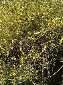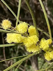 The shrub or small tree typically grows to a height of around 1 to 7 m (3 ft 3 in to 23 ft 0 in) and has an upright and open habit with hairy, yellow-ribbed angular branchlets. Like most species of Acacia it has phyllodes rather than true leaves. The glabrous, thinly coriaceous and evergreen phyllodes have a narrowly linear or occasionally linear-oblanceolate shape are usually mostly incurved. The phyllodes are 4 to 17 cm (1.6 to 6.7 in) in length and 1 to 7 mm (0.039 to 0.276 in) wide and have three raised distant nerves.[3] It blooms between July and October producing inflorescences that appear in groups of one to three, or sometimes as many as seven, on an axillary axis that is 1 to 15 mm (0.039 to 0.591 in) in length. Sometimes these will appear in the axils of the phyllodes. The spherical flower-heads have a diameter of 5 to 10 mm (0.20 to 0.39 in) and contain between 20 and 40 lemon yellow to bright yellow coloured flowers.[1] Following flowering it produces straight, thinly leathery to firmly papery, brittle seed pods that are flat but are raised over each of the seeds. The pods are 3 to 11.5 cm (1.2 to 4.5 in) in length and 3 to 5 mm (0.12 to 0.20 in) wide with sparsely distributed hairs.[1]