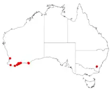 It is native to an area along the south coast in the Goldfields-Esperance and Great Southern regions of Western Australia where it is commonly situated in moist areas, on low rises and rocky hillsides growing in gravelly sandy soils over and around areas of laterite.[1] The range of the plant extends from around Cape Riche in the west to the Fitzgerald River National Park as a part of mallee heath or mixed scrub communities.[2]