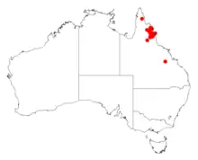 It is endemic to a small part of north eastern Queensland in the Cook District near Spring Creek approximately 40 km (25 mi) north west of Mount Carbine where it is usually situated on rocky ridges and disturbed areas growing in skeletal sandy soils as a part of Eucalyptus woodland communities.[2] The range of the shrub extends from west of Cooktown in the north extending down the western edge of the Great Dividing Range to near Mount Surprise covering a total area of around 29,150 km2 (11,250 sq mi).[3]