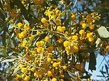 The tree or shrub typically grows to a height of 1 to 7 metres (3 to 23 ft)[1] but can sometimes reach up to 10 m (33 ft). It has rough, corky and fissured bark with pendulous brittle branchlets. The green to yellowish green to grey green phyllodes have an oblanceolate to narrowly oblanceolate shape and are straight to shallowly recurved. Each phyllode has a length of 6 to 15 cm (2.4 to 5.9 in) and a width of 10 to 30 mm (0.39 to 1.18 in) and has three distant main nerves.[2] It blooms from June to October and produces yellow flowers.[1] Each racemose inflorescence has an axis with a length of 3 to 17 cm (1.2 to 6.7 in) with spherical flowerheads contain 30 to 50 bright golden flowers. After flowering flat, straight, narrowly oblong seed pods form with a length of around 8 cm (3.1 in) and a width of 8 to 12 mm (0.31 to 0.47 in). The dull brown seeds inside have an oblong-elliptic shape and are 5.5 to 6.5 mm (0.22 to 0.26 in) in length.[2]
