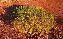 The low spreading, viscid shrub typically grows to a height of 0.2 to 1 metre (1 to 3 ft).[2] The obscurely ribbed branches normally spread horizontally giving the shrub a flat-topped appearance. The green to grey-green phyllodes are solitary or sometimes in clusters of two or three at the nodes. Each phyllode is 2 to 7 centimetres (0.8 to 2.8 in) in length and has a diameter of about 1 millimetre (0.04 in) and are straight or curve shallowly upward.[1] It blooms from March to October producing golden yellow flowers.[2] The simple inflorescences have an erect flower spike that is 10 to 45 mm (0.4 to 1.8 in) in length. Following flowering flat, thick and linear dark brown seed pods with a length of 2 to 8 cm (0.8 to 3.1 in) and a width of 2 to 6 mm (0.08 to 0.24 in). The erect and woody pods are sticky with resin and have an odour resembling like citronella or lemon grass. The ellipsoidal dull to slightly shiny brown seeds are 3 to 5.5 mm (0.12 to 0.22 in) long.[1]