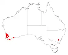 It is native to an area along the south coast in the Peel and South West regions of Western Australia.[1][4] It is often situated on rocky hillsides growing in sandy or gravelly soils over granite[1] particularly in the Darling Range usually as a part of Eucalyptus woodland communities.[2]