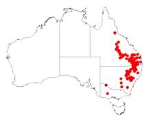 The bulk of the population is found along the western plains and slopes down the Great Dividing Range from near Mount Wilson in New South Wales in the south to around Miles in Queensland in the north. Other smaller populations are found even further north around Jericho and Alpha where it grows in gravelly and sandy soils as a part of woodland containing species of Casuarina, Eucalyptus and Callitris.[3]