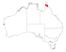 The shrub has a limited range in far north Queensland on the Cape York Peninsula around Weipa where it grows in gravelly ironstone soils.[1]