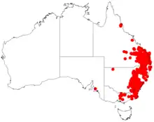 It occurs in the Australian states of the Australian Capital Territory, New South Wales, Queensland and Victoria, and as an introduced species on New Zealand's North Island and South Island.[6][1] The variety A. p. var. penninervis occurs in the same Australian states of the Australian Capital Territory, New South Wales, Queensland, and Victoria.[7] The variety A. p. var. longiracemosa occurs in coastal districts of southern Queensland, and northern New South Wales.[8]
