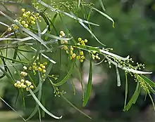 The tree has a slender and erect habit and typically grows to a height of up to 10 metres (32.8 ft). It has a bushy crown and usually has a single stem but can divide into several stems at ground level[1] which have smooth grey coloured bark. The branchlets are usually pendulous and are angled or flattened and a reddish-brown often covered with a white powdery finish.[2] It has straight or shallowly recurved, glabrous, blue-green to grey-green phyllodes[1] that have a narrowly oblanceolate to narrowly elliptic or linear shape with a length of 7 to 22 cm (2.8 to 8.7 in) and a width of 3 to 15 mm (0.12 to 0.59 in). It blooms throughout the year[3] but most heavily between September and January producing racemose inflorescences with spherical flower-heads containing between 18 and 50 flowered golden to pale yellow coloured flowers. After flowering linear brown seed pods form that are up 16 cm (6.3 in) in length and 5 to 17 mm (0.20 to 0.67 in) wide with a firm papery texture. The dull to slightly shiny dark brown to black seeds within the pods have an oblong to oblong-elliptic shape and a length of 4 to 6 mm (0.16 to 0.24 in).[2]