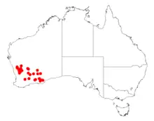 It is native to an area in the Wheatbelt and Goldfields-Esperance regions of Western Australia where has a scattered distribution and it is commonly situated on flats and plains growing in sandy or loam and sandy clay soils that can contain a lot of gravel[1] as a part of low open woodland or tall open shrubland and open heathland communities. It is found from around Gutha and Wongan Hills in the west to around near Southern Cross and Koolyanobbing in the north east.[2]
