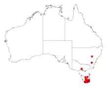 Acacia riceana is endemic to the southeast corner of Tasmania where it grows from sea level to 900 m (3000 ft). Its main populations center around the Derwent, Huon and Prosser River Valleys, although small populations are also located on the slopes of the Ironbound Range in the state's far south. The species also grows densely on slopes overlooking the D'Entrecasteaux Channel from Southport to Margate. Outlying populations grow on the Tasman\Forester Peninsula and South Bruny Island with the most remote being located on Maria Island.