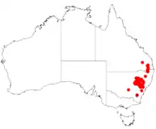 It is endemic only in a small area in south eastern Queensland from around Barakula, Wallangarra and Goombungee in the north and down to around Dubbo in New South Wales in the south where it is found in a variety of habitats growing in stony sandy-loamy soils as a part of open Eucalyptus or Callitris woodland communities.[2]
