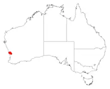 It is native to a small area in the Wheatbelt region of Western Australia[2] all found in a single population to the north west of Dandaragan growing gravelly loam soils among laterite breakaways as a part of low Eucalyptus woodland communities.[3]