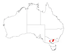 It has a disjunct distribution from around the Howqua River, and Carboor East and in areas close to Taradale where it is often situated on rocky hills as a part of woodlands or Eucalyptus forest communities.[2]