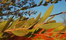 The multi-stemmed tree or shrub typically to a height of 1 to 6 metres (3 to 20 ft) and has a rounded bushy habit. It has light to dark grey coloured bark that is longitudinally fissured and forms small flakes. The terete branchlets are densely to sparsely puberulous and have broadly triangular dark brown stipules with a length of around 1 mm (0.039 in). The green, narrowly elliptically shaped phyllodes are flat and straight to shallowly incurved. Each phyllode has a length of 3.5 to 9.5 cm (1.4 to 3.7 in) and a width of 7 to 20 mm (0.28 to 0.79 in) with two or three prominent longitudinal main nerves.[1] Although it flowers across a wide time span over most of the continent, in Western Australia it is much more restricted, blooming only from May to September producing yellow flowers.[2] The dense flower spikes are paired in phyllode axils and have a length of 2 to 5 cm (0.79 to 1.97 in). After flowering linear, straight to curved seed pods form with a length of 5.5 to 13.5 cm (2.2 to 5.3 in) and a width of 3 to 4 mm (0.12 to 0.16 in). The dark brown seeds in the pod have a narrowly oblong shape and a length of around 5 mm (0.20 in).[1]
