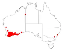 It is native to an area in the Great Southern, Goldfields-Esperance and Wheatbelt regions of Western Australia where it is commonly situated among granite outcrops, on undulating plains, rocky ridges, rises and hills growing in gravel lateritic, sandy, clay or loamy soils.[2] The range of the plant extends from around Corrigin in the north west to around Albany in the south west and then extending eastward through coastal or near-coastal areas to around Israelite Bay in the east.[1]