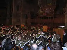 As with the other 'ancient universities' in Scotland, undergraduates at the University of Edinburgh are entitled to wear an undergraduate gown, made of scarlet Russell cord and cut in the London undergraduate shape.[1] In recent times the undergraduate gown has been worn most commonly by members of the Edinburgh University Singers and by students taking part in the traditional festivities surrounding the installation of the Rector.