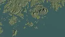 That same day we also passed near an island about four or five leagues [12–15 mi; 19–24 km] in length, off which we were almost lost on a little rock, level with the surface of the water, which made a hole in our pinnace close to the keel. The distance from this island to the mainland on the north is not a hundred paces. It is very high and cleft in places, giving it the appearance from the sea of seven or eight mountains one alongside the other. The tops of them are bare of trees, because there is nothing there but rocks. The woods consist only of pines, firs, and birches.[27]