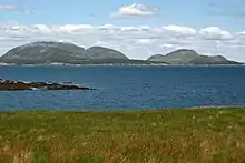 The park includes mountains, an ocean coastline, woodlands, lakes, and ponds. In addition to nearly half of Mount Desert Island, the park designation also preserves a portion of the Schoodic Peninsula on the mainland, as well as the majority of Isle au Haut and Baker Island, all of Bar Island, three of the four Porcupine Islands (Sheep, Bald and Long), the Thrumcap (an islet), part of Bear Island, and Thompson Island in Mount Desert Narrows, as well as several other islands and islets.[6] Bar Island, which can be visited on foot over a sandbar around low tide,[7] and the Porcupine Islands are in Frenchman Bay by Bar Harbor.[6] About 57 mi (92 km) of carriage roads were designed and financed by John D. Rockefeller Jr. on Mount Desert Island,[8] 45 miles (72 km) of which continue to be maintained inside the park.[9]
