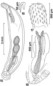 Acanthocephalus parallelcementglandatus from Clarias batrachus. 15) Holotype male. Note the piercing of the incomplete outer proboscis receptacle posteriorly with retractor muscles. 16) A typical hook near the middle of the proboscis 17. Proboscis 18) Posterior part of the reproductive system showing detail of the parallel cement glands, common cement ducts, and sperm duct system (dotted).