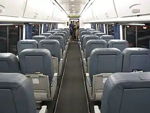 The First Class car has 44 seats, being three seats across (one on one side, two on the other side), four seat tables and assigned seating. There are 260 Business Class seats on each set; these cars have four seats across (two on each side) and four-seat tables.[43] Baggage may be stowed in overhead compartments or underneath seats. Trains are wheelchair-accessible. Each car has or two toilets, with one being ADA compliant. Automatic sliding doors between cars reduce noise.