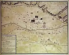 Historically, ditch irrigation was used for centuries by the indigenous peoples of the Southwest, however the Spanish colonialists have been credited with bringing knowledge of engineering and irrigation/water regulation law to New Mexico.[1] The Acequia Madre was documented in the José de Urrutia map (c. 1766)[2] which shows the acequia running along the muralla, or early fortification wall of Santa Fe, and marks its position in relation to the Santa Fe River.[1]