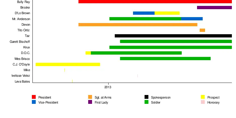 D'Lo Brown1st Vice-President, later ProspectMarch 7, 2013July 7, 2013Was demoted to Prospect on May 2, 2013 after losing an I Quit match to Kurt Angle, later left the group and the company.