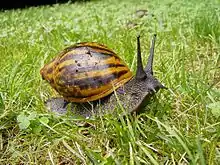 Achatina achatina, commonly known as the giant African snail, also known as the giant tiger land snail, and gigantocochlea , is a species of large, air-breathing land snail, a terrestrial pulmonate gastropod mollusk in the family Achatinidae. The name "Achatina" is from "achates", Greek for agate.[1] It shares the common name "giant African snail" with other species of snails such as Lissachatina fulica and Archachatina marginata.