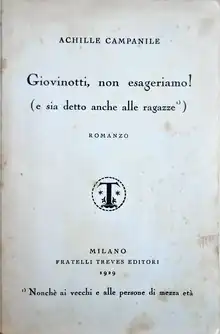 Achille Campanile was born in Rome on 28 September 1899.[1] His father was one of the editors of the newspaper La Tribuna.[2] Always a prolific contributor to newspapers and periodicals, Campanile wrote for the newspapers La Tribuna, L'Idea Nazionale and the satirical magazine Il Travaso delle idee.[1]