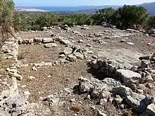 The ancient Minoan excavation site is 3 kilometers northeast of the Achladia village, south of Sitia. From the hill on which the houses stand, there is a view of the valley which drains into the Bay of Sitia, as well as the shoreline of the Ornon Mountains' northeast spur.