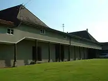 Achstetten Castle is a spacious three-storey building in classicist style with a risalit in its centre.[2] Two wings are loosely attached to the main structure at a right angle. These two wings function as economy buildings. On three sides the castle is surrounded by a large park, which is home to an enclosure where fallow deer are kept.[3] The main access to the castle is by a driveway measuring about 150 metres (490 ft) long. Noteworthy of the interior are a classicist staircase, 19th century furniture, an iron stove from 1798, portraits of the Freyberg family and a porcelain collection.[4] A raised and roofed passageway on wooden pillars connects the castle to the nearby church.[5] This passageway has a length of approximately 100 metres (330 ft).[6] Passageways of this kind, which enabled the lord of the castle and his family to enter the church without being subject to the weather, were not uncommon; remnants of such a construction can also be seen at Großlaupheim Castle.[7]