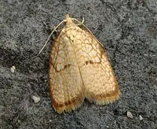 The wingspan is 12–17 mm. The ground colour of the forewings is yellowish underlying a reticulated darker pattern and a greyish suffusion across the disc. Julius von Kennel provides a full description. [2]