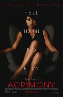 Acrimony is a 2018 American psychological thriller film written, produced and directed by Tyler Perry. The film stars Taraji P. Henson, Lyriq Bent and Crystle Stewart. It follows a betrayed wife who stalks and nearly kills her ex husband when he becomes successful after she spent her whole life supporting him. Principal photography began in October 2016 in Pittsburgh. Acrimony was released in the United States by Lionsgate on March 30, 2018.[5][6] It received generally negative reviews and grossed $46 million worldwide.