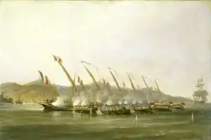 On 31 July 1811, Commander Maunsell of the sloop the Procris discovered a convoy of 40 or 50 proas, escorted by six French gun-boats in the mouth of the Indramayo river.[1] Launching boats they were able to board and capture five of the French gun-boats in quick succession; the sixth blew up.[1] Meanwhile, however, the convoy escaped up the shallow muddy river.[1]