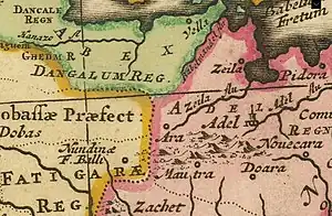 Adal was situated east of the province of Ifat and was a general term for a region inhabited by Muslims.[7][8] According to Portuguese explorer Francisco Alvarez, Adal in 1520 bordered on the Abyssinian frontier province of Fatagar in the west and stretched to Cape Guardafui in the east.[9] He further stated that it was confined by the Kingdom of Dankali in the north west and that the leaders of Adal were considered saints by the locals for their warfare with neighboring Abyssinia.[10]