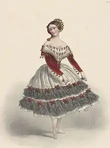 She became a principal in the Paris Opera Ballet in 1845, first dancing in La péri.[3] She went on to perform in the premières of Ozaï (1847), Nisida ou les Amazones des Açores (1848) and Vert-vert (1851).[2] She also appeared with Sofia Fuoco in ballet sequence in the opera La Juive and in La Filleule des fées (1850).[3] From 1856 to 1857, she appeared with Pasquale Borri at La Fenice in Venice before moving to Rome where she performed for a few years.[2]
