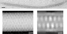 Adnaviruses have filamentous virions, i.e. they are long, thin, and cylindrical. Lipothrixviruses have flexible virions about 900 nanometers (nm) in length and 24 nm in width in which the nucleoprotein helix is surrounded by a lipid envelope.[3] Tristromaviruses, about 400 by 32 nm, likewise have flexible virions with an envelope, and they contain an additional protein sheath layer between the nucleoprotein complex and the envelope.[5][9] Rudviruses have stiff, rod-like virions about 600–900 by 23 nm.[4] At both ends of the virion, lipothrixviruses have mop- or claw-like structures connected to a collar, whereas rudiviruses and tristromaviruses have plugs at each end from which bundles of thin filaments emanate.[3][5][10]