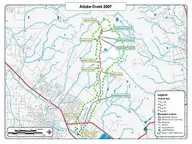 Adobe Creek drains an area of about 10 square miles (26 km2).[1] Its headwaters lie in Lafferty Ranch, a 270-acre (1.1 km2) parcel of land owned by the City of Petaluma since 1995. Lafferty Ranch has been proposed for a wilderness park, but is not accessible to the public.[4] Petaluma Reservoir (which formerly provided water for the city of Petaluma) is located in the Adobe Creek watershed.