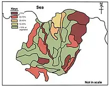 Valley colluvium refers to the loose, unconsolidated sediments that have been settled inside the water courses and are driven by river mechanisms.[1] They are thin in shape and extended into straight lines that follow the river channels.[1] The plants grown on the valley colluvium are thicker than the nearby areas.[1] Woody plants and large bushes dominate the vegetation.[1]