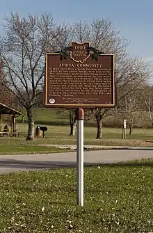 A historic marker in the area recounts the history of how the community was divided by the slavery question and of how Africa received its name: