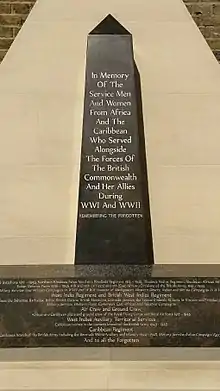 In Memory Of The Service Men And Women From Africa And The Caribbean Who Served Alongside The Forces Of The British Commonwealth And Her Allies During WW1 and WW2[13]